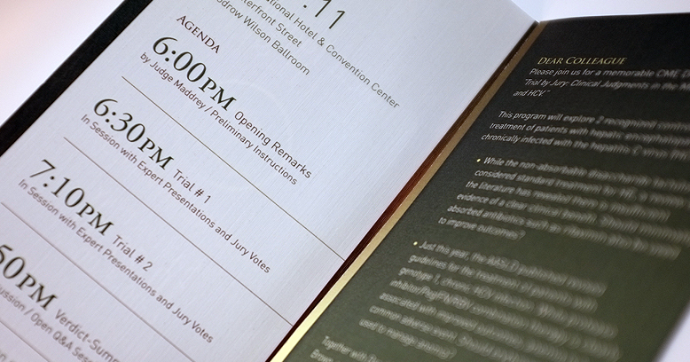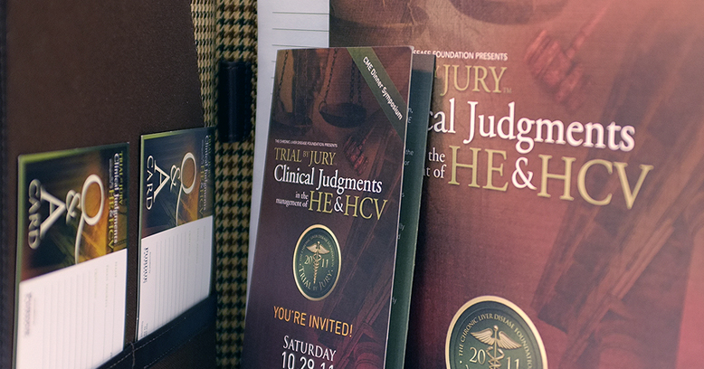 We were presented with a unique challenge from the Chronic Liver Disease Foundation: design material for a medical education symposium that doesn't look like your typical medical or pharmaceutical event. The client wanted a symposium where different treatment methods could be debated by the speakers, and what better way to stage this than by having a mock trial. We were very pleased with this approach because it allowed us get creative with an industry that is typically very rigid and predictable.
